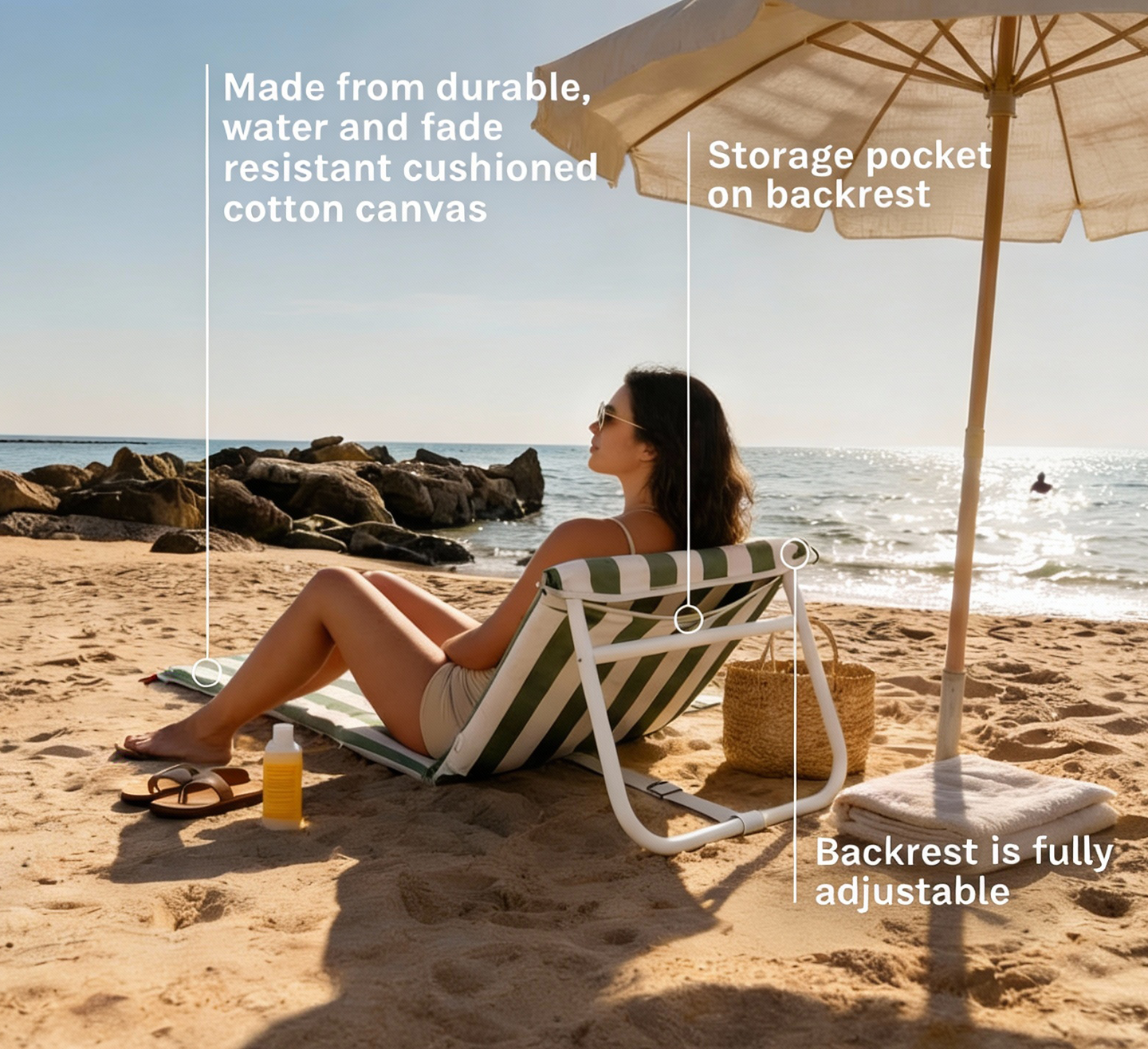 Features easy-access storage, adjustable backrest, and durable, easy-to-clean material for the ultimate beach experience.